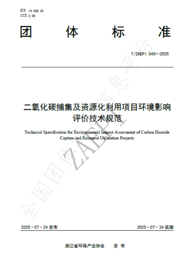 2025年7月24日,由浙江省環(huán)保集團(tuán)生態(tài)環(huán)保研究院牽頭制定的《二氧化碳捕集及資源化利用項(xiàng)目環(huán)境影響評(píng)價(jià)技術(shù)規(guī)范》(T/ZAEPI 045-2025)團(tuán)體標(biāo)準(zhǔn)正式發(fā)布并實(shí)施。該標(biāo)準(zhǔn)由浙江省環(huán)保產(chǎn)業(yè)協(xié)會(huì)歸口管理,聯(lián)合省內(nèi)多家環(huán)保領(lǐng)域骨干企業(yè)共同起草,填補(bǔ)了工業(yè)領(lǐng)域二氧化碳捕集及資源化利用項(xiàng)目環(huán)評(píng)技術(shù)規(guī)范的空白。